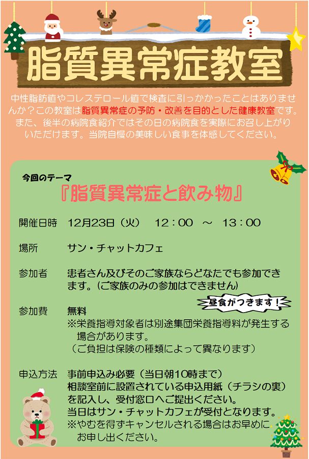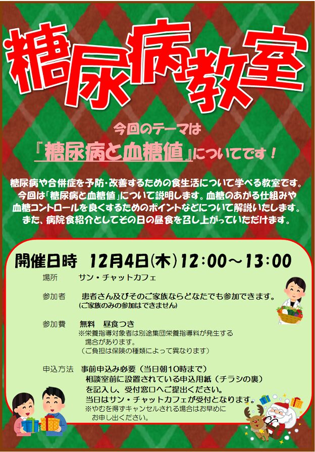 栄養課では毎月様々な健康教室を開催しています!糖尿病や肝臓病、脂質異常症などといった生活習慣病を予防・改善するための食事選びのポイントや、間食、飲酒習慣で気をつけたいことなどについて分かりやすく解説しています。また、当院自慢の食事を体感していただける病院食紹介のコーナーも実施しています!疾患の有無にかかわらず、当院に通院されている方およびそのご家族ならどなたでも参加できます。生活習慣病を改善したい方、または予防したい方の参加をお待ちしております!