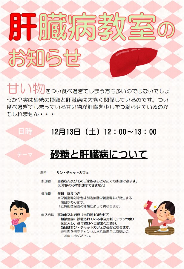 いずれも事前申込が必要となっておりますので、病院入口や相談室前に設置されている申込用紙をご記入の上、受付窓口にご提出ください。当日はサン・チャットカフェに直接お越しください。多くの方のご参加をお待ちしております!