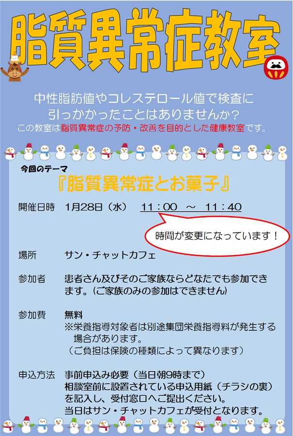 - 栄養課では毎月様々な健康教室を開催しています!糖尿病や肝臓病、脂質異常症などといった生活習慣病を予防・改善するための食事選びのポイントや、間食、飲酒習慣で気をつけたいことなどについて分かりやすく解説しています。疾患の有無にかかわらず、当院に通院されている方およびそのご家族ならどなたでも参加できます。生活習慣病を改善したい方、または予防したい方の参加をお待ちしております!