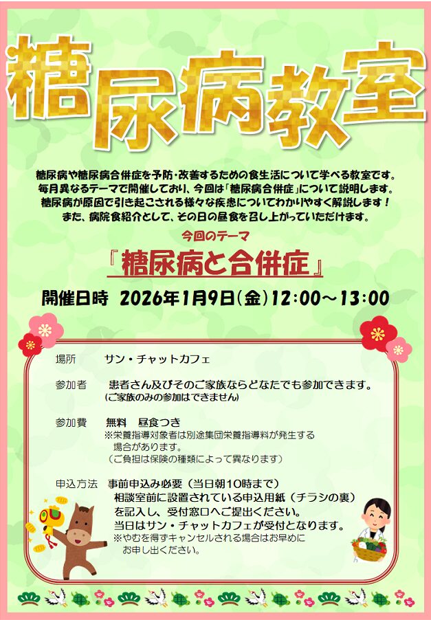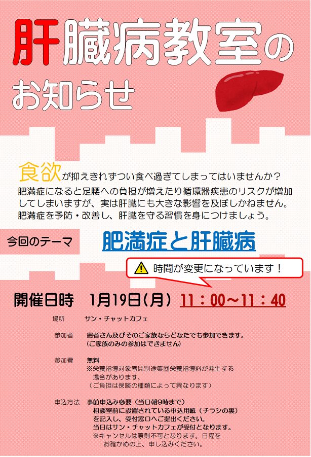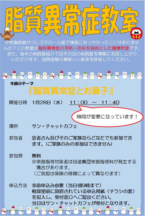 - 栄養課では毎月様々な健康教室を開催しています!糖尿病や肝臓病、脂質異常症などといった生活習慣病を予防・改善するための食事選びのポイントや、間食、飲酒習慣で気をつけたいことなどについて分かりやすく解説しています。疾患の有無にかかわらず、当院に通院されている方およびそのご家族ならどなたでも参加できます。生活習慣病を改善したい方、または予防したい方の参加をお待ちしております!