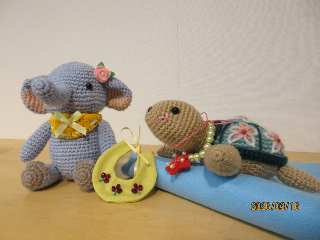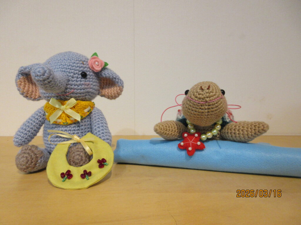 「甲羅の刺繍やスタイ作りが難しかったです。あみぐるみは数を作ってみるしかないな、そしてビーズ細工や刺繍も勉強しないといけないなと感じています」とのコメントをいただいています。あみぐるみに色々な装飾が施されている作品は難易度が上がってきますね。その分可愛らしさや魅力が増してきます。是非細部までご覧下さい。