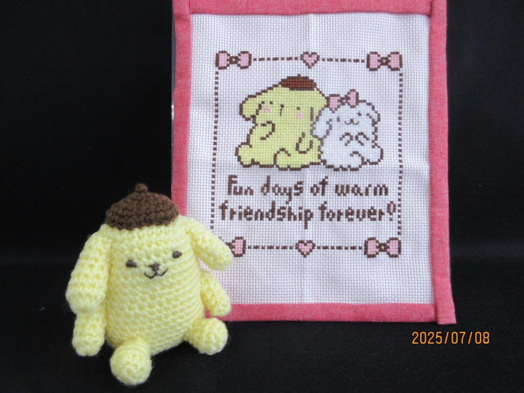 クロスステッチと編みぐるみのセットの作品です。クロスステッチから編みぐるみが飛び出してきたようで楽しい作品です。
