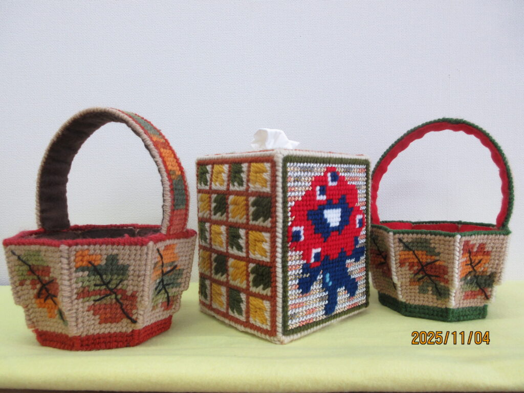 ミャクミャクくん 2025.12.07 外来作業療法利用者さんの作品を紹介します。 「ティッシュボックスケースと八角形のカゴと色づく葉っぱをいっぱい散らして作りました。ステッチするのも組み立てるのも楽しくて夢が膨らみました。」とのコメントをいただいています。 作業療法