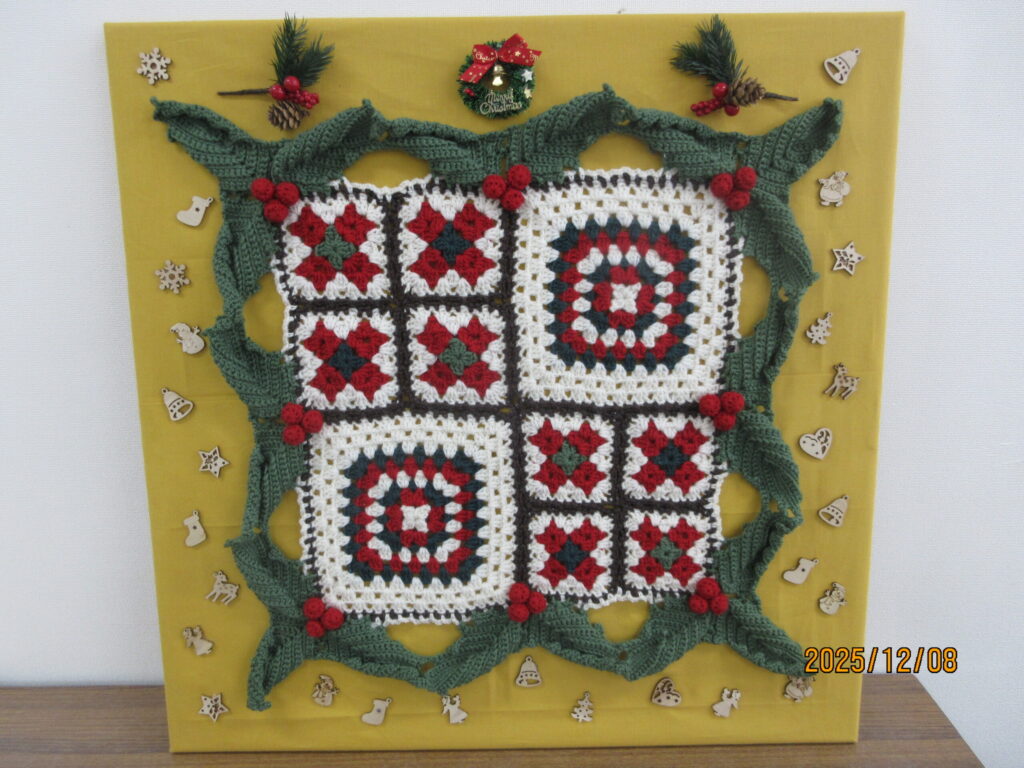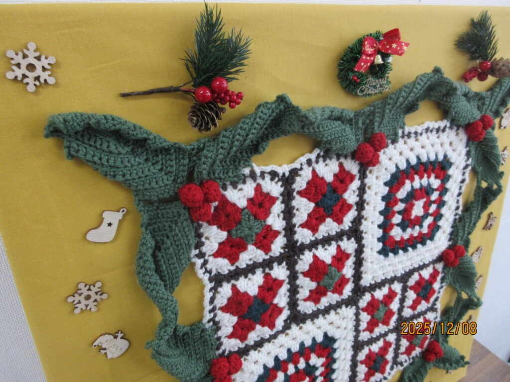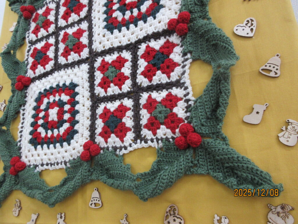 「クリスマスカラーのモチーフつなぎの周囲をヒイラギのモチーフで縁取りしたものです。ヒイラギを一枚ずつ編みながら繋いでいくところを頑張りました。」とのコメントをいただいています。