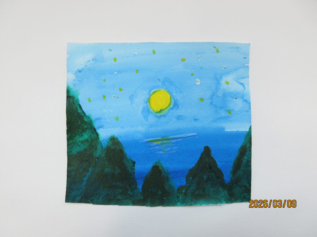 「アクリル絵の具を使いました。乾きが早いのではやく描きました。心象風景です。」とのコメントをいただいています。色の濃淡で夜空や緑の木々を素敵に表現されています。水面に映る月明かりも素敵ですね。