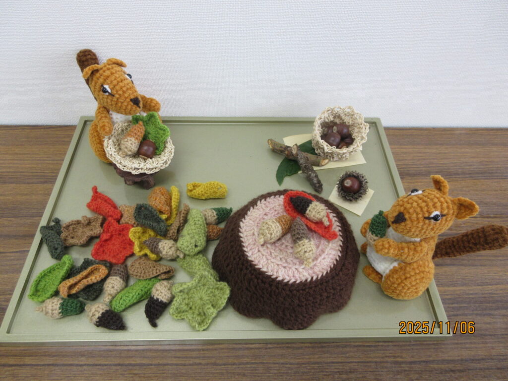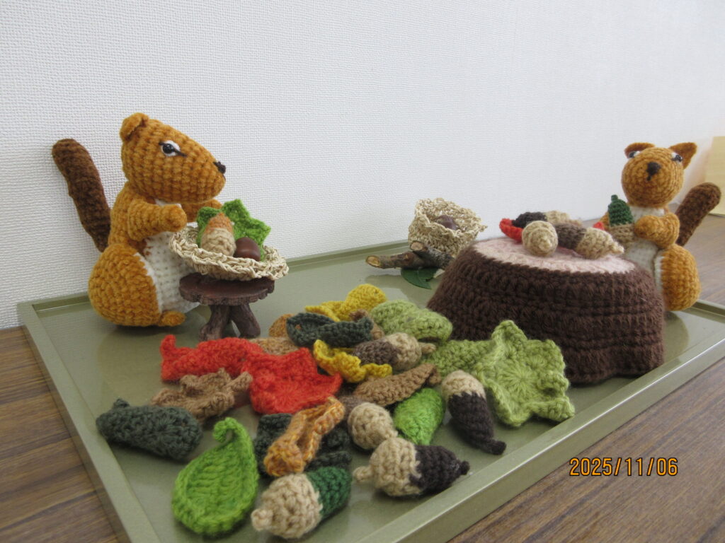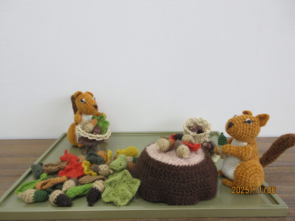 「冬支度に大忙しのリスたちが食糧を沢山集めている様子です。どんぐりや葉っぱをいっぱい編むのは楽しかったです。リスらしい姿に表現するのが難しく、くじけそうになったけどアドバイスをいただいたり、本物のどんぐりや枝を拾ってきて下さったりと、スタッフさん方のおかげでリスたちも冬の準備が出来たと思います」とのコメントをいただいています。
