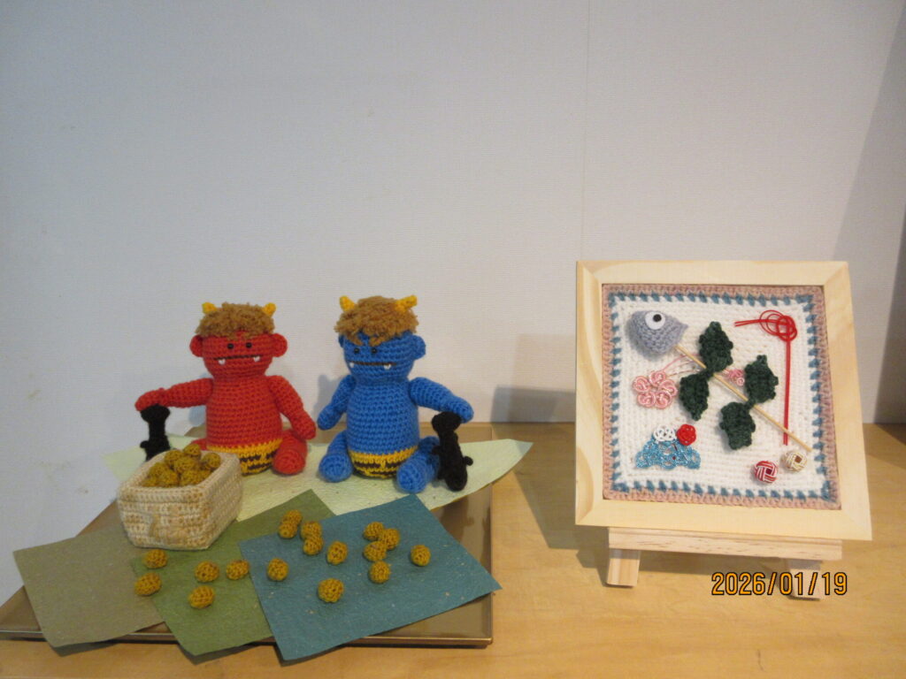 編み物で色々な形が出来ることに改めて驚きました。こんな可愛い赤鬼青鬼だと「鬼はそと!」って言いにくくなってしまいますね。