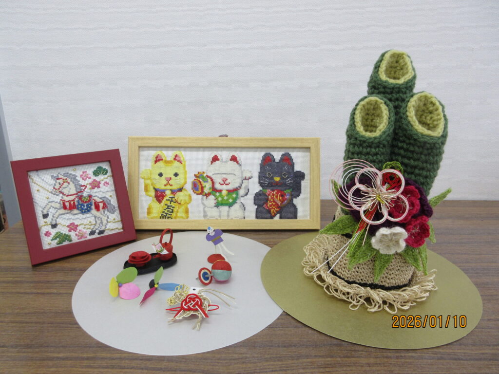 「新年の願いを込めたものです。スタッフさんやメンバーさん方のアドバイスを頂きながら完成したのはお正月を迎えてからでした。門松をかぎ針編みで作れたことは嬉しかったです。」とのコメントを頂いています。編み物の門松、クロスステッチの招き猫・干支の午と縁起物がずらりと並びました。一つ一つがとても丁寧に作られていて素晴らしい作品達です。