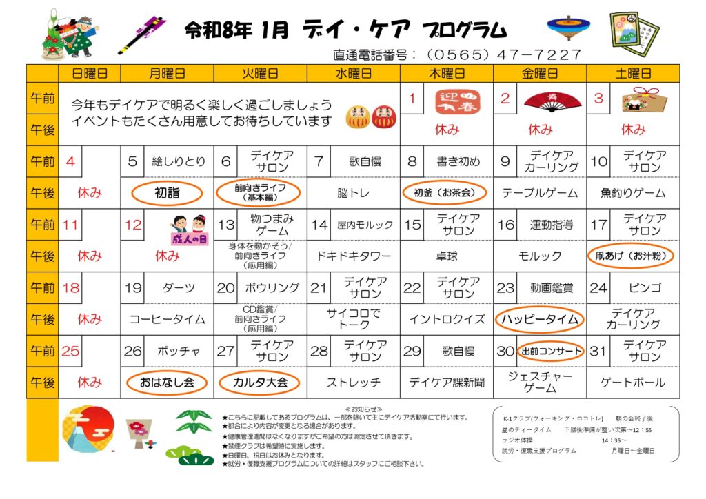 2026年1月のデイ・ケアとデイ・ナイト・ケアプログラム表が出来ました。