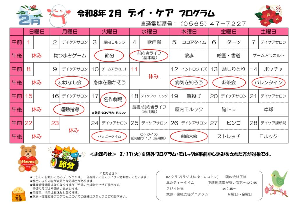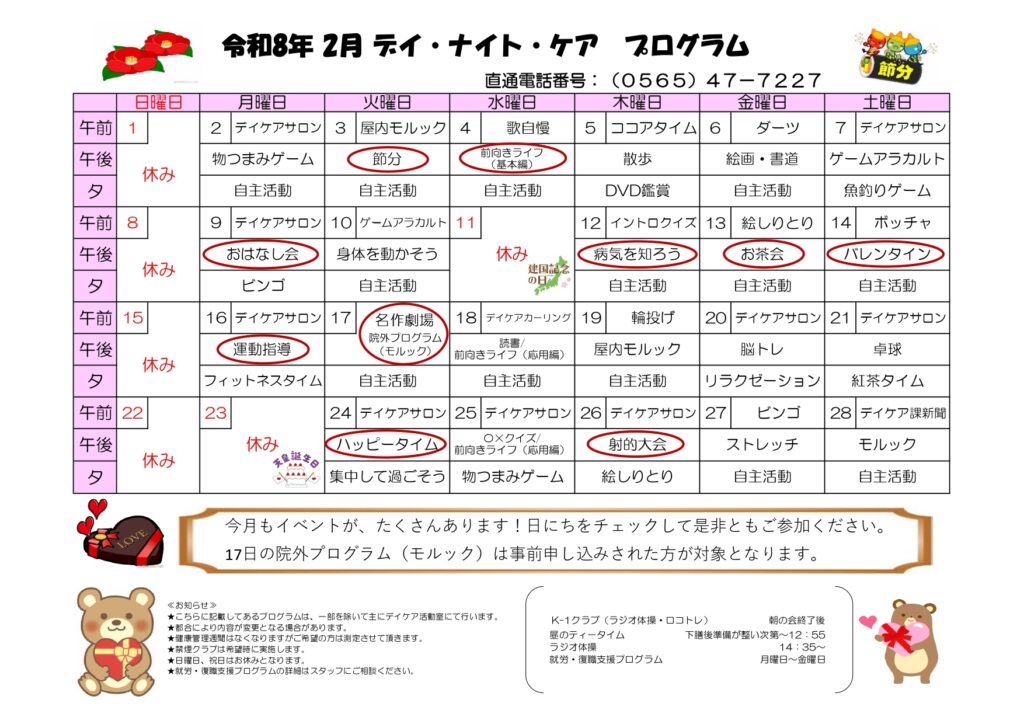 2026年2月のデイ・ケアとデイ・ナイト・ケアプログラム表が出来ました。