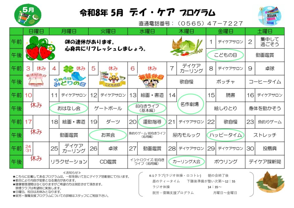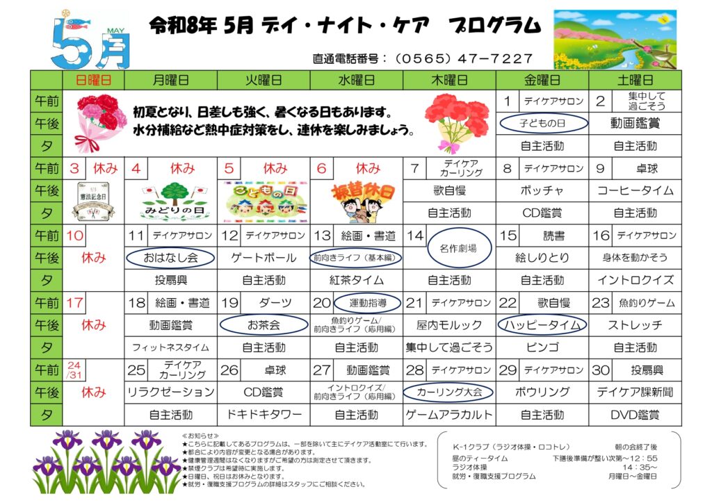 2026年5月のデイ・ケアとデイ・ナイト・ケアプログラム表が出来ました。