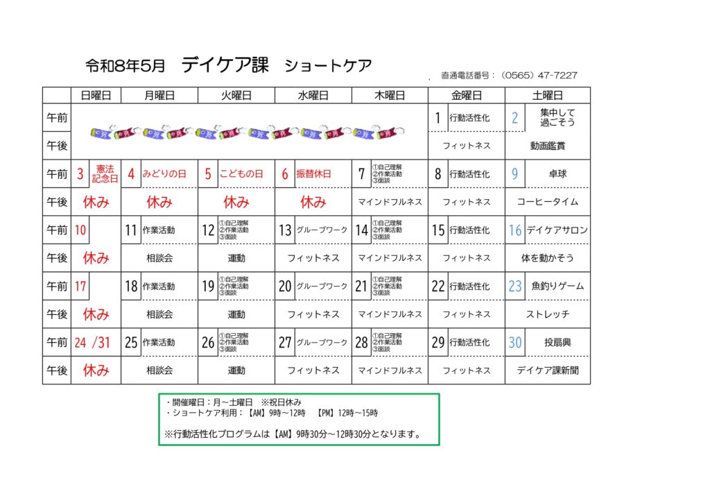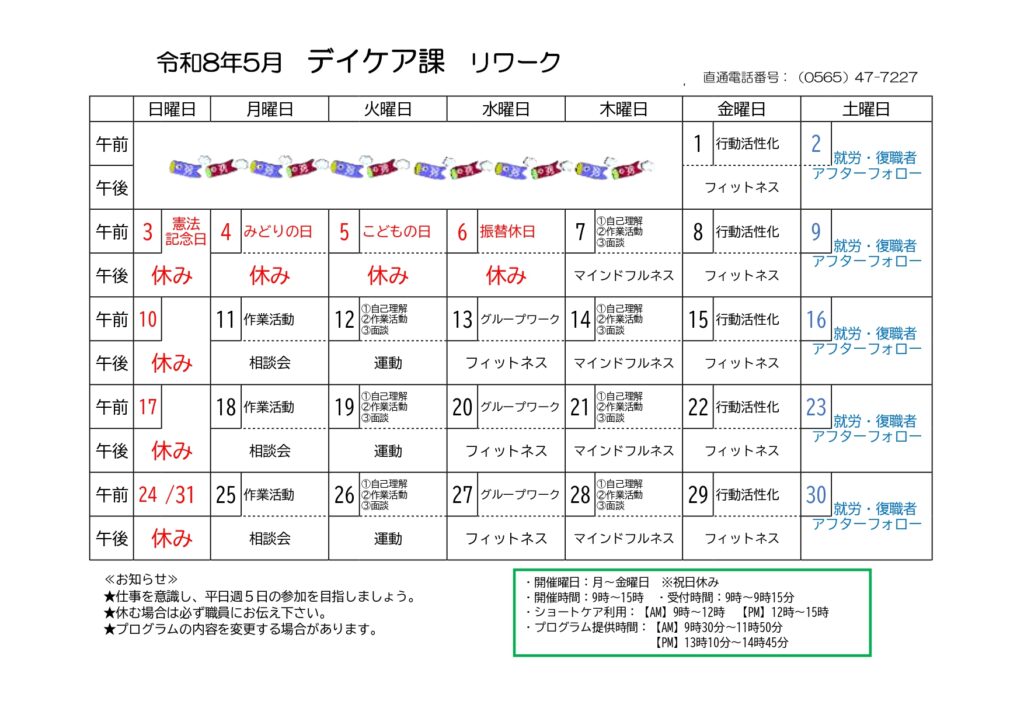 2026年5月分のリワーク、ショート・ケアプログラム表が出来ました。